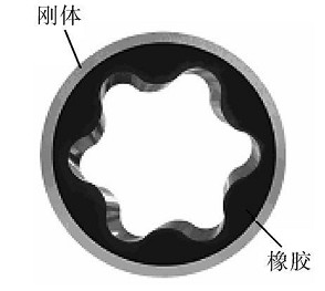 1、馬達(dá)總成常規(guī)螺桿鉆具:馬達(dá)的加工工藝是將橡膠澆鑄在光滑內(nèi)壁定子殼體上(如圖1),橡膠襯套的內(nèi)表面是螺旋曲面,與轉(zhuǎn)子相互嚙合,利用二者的導(dǎo)程差形成螺旋密封腔來完成能量轉(zhuǎn)換;外表面為圓柱形,粘合于光滑內(nèi)壁的定子殼體上,這種結(jié)構(gòu)會(huì)導(dǎo)致在注膠過程中橡膠在定子殼內(nèi)出現(xiàn)波峰和波谷,橡膠厚薄相差較大。由于橡膠襯套在硫化過程中會(huì)出現(xiàn)波峰、波谷處,則橡膠易老化、掉膠,加之螺桿鉆具轉(zhuǎn)子在定子內(nèi)長(zhǎng)時(shí)間工作,因此容易出現(xiàn)掉塊、撕裂和脫膠現(xiàn)象,導(dǎo)致馬達(dá)過早失效,縮短了螺桿鉆具的使用壽命。